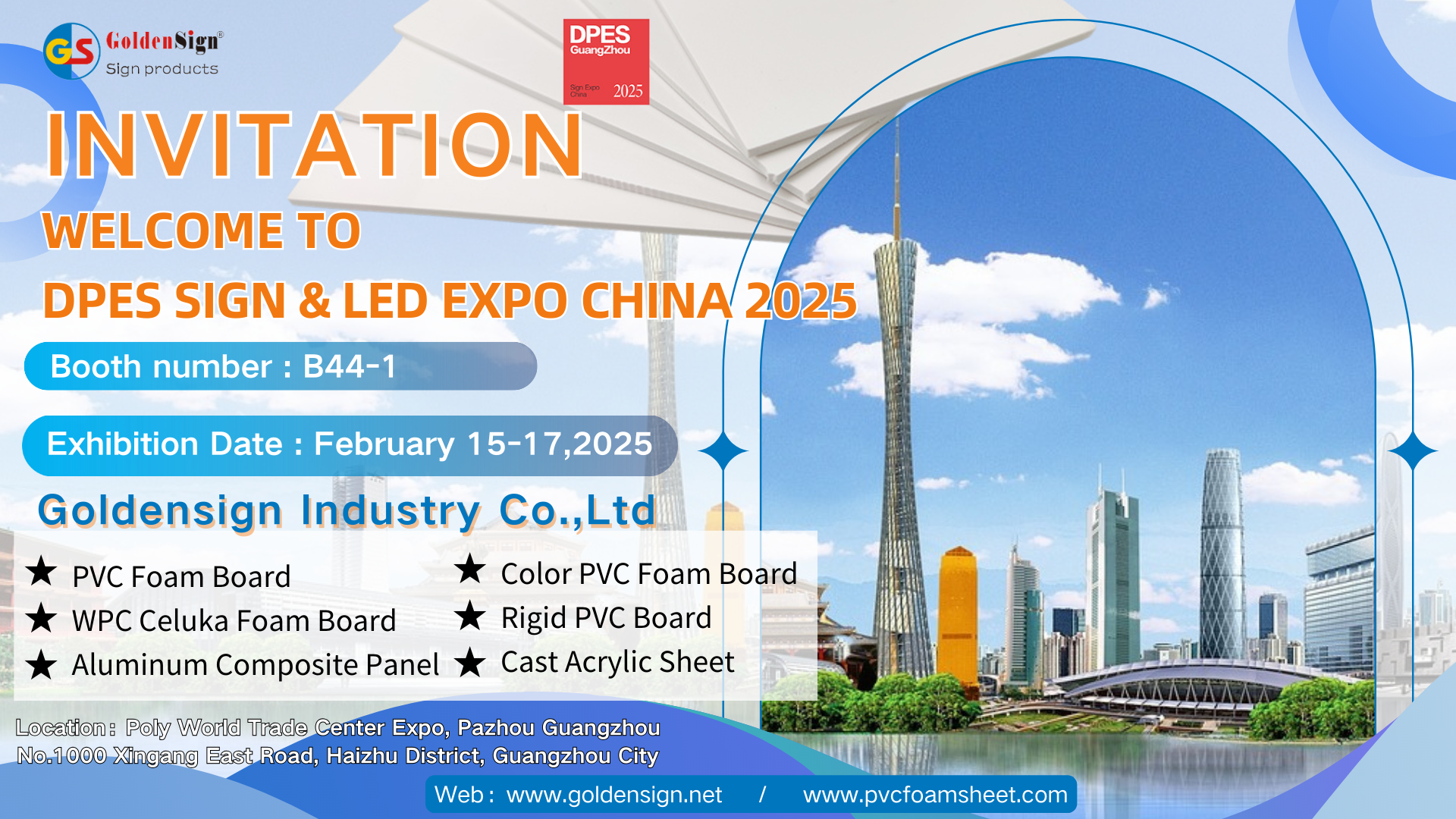Goldensign熱忱邀請所有客戶和行業合作夥伴蒞臨我們的展位(B44-1),了解更多關於我們的產品和解決方案。我們期待與您在迪培思2025中國國際廣告及LED博覽會上共同探討PVC發泡板等環保材料在廣告行業的實際應用。
